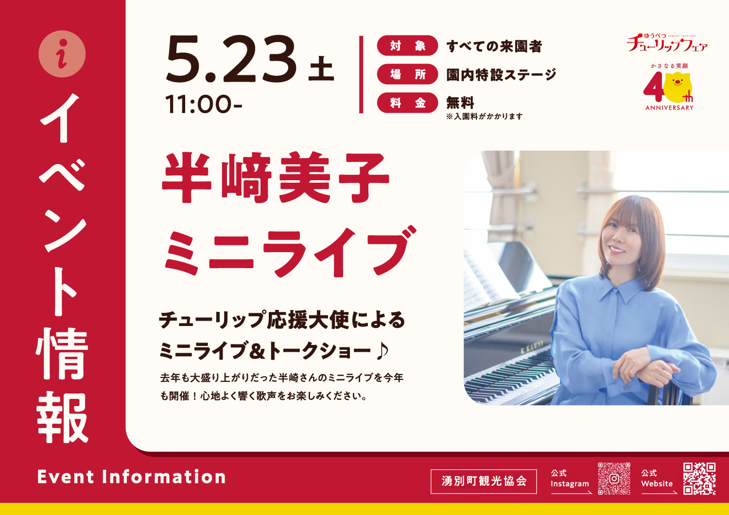 5月23日(土)午前11時より、公園内特設会場にてチューリップ応援大使である半崎美子のミニライブ&トークショーを開催します。